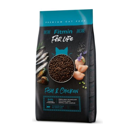 Fitmin For Life Fish & Chicken הוא מזון סופר פרימיום מלא ומאוזן, שתוכנן במיוחד כדי לענות על הצרכים התזונתיים של חתולים בוגרים. השילוב הייחודי של בשר דגים טרי ועוף איכותי מבטיח טעימות גבוהה במיוחד, %84 חלבון ממקורות מן החי התומך בשימור מסת השריר, ורכיבים טבעיים התומכים בעיכול קל ובריאות העור והפרווה.